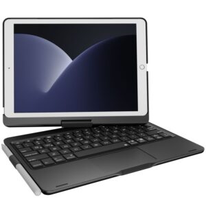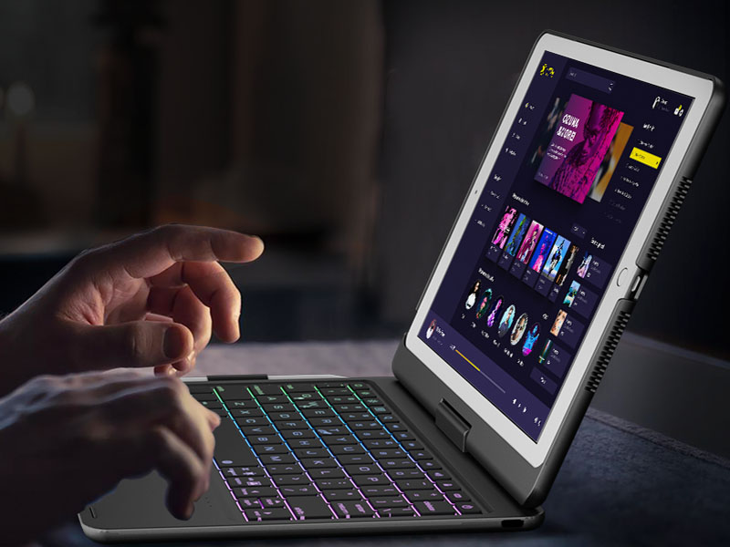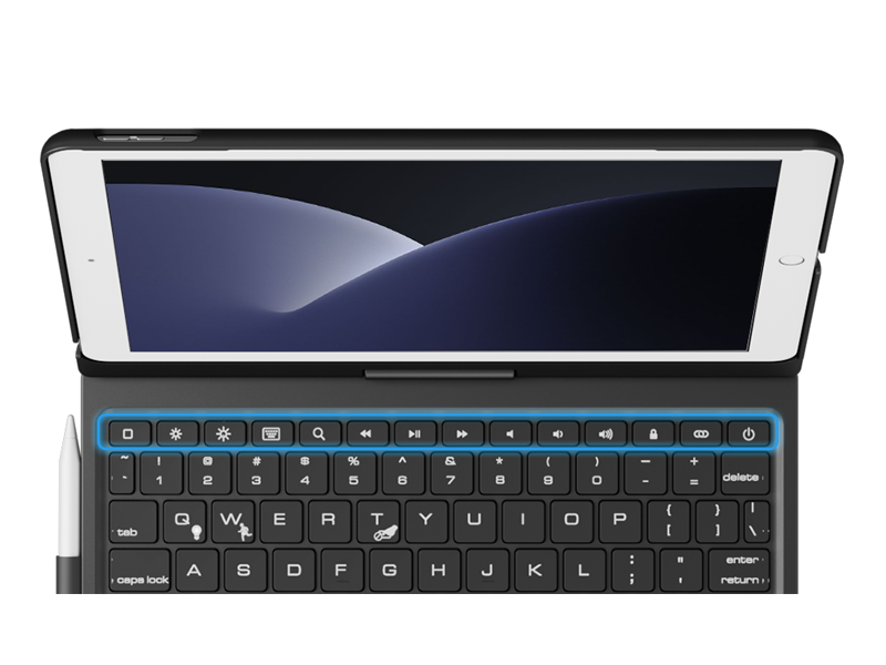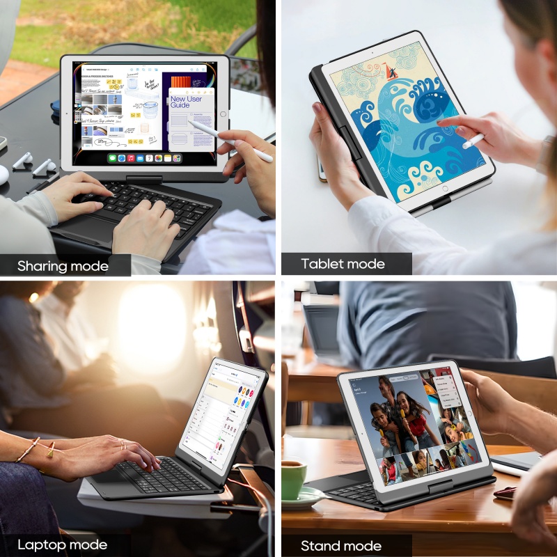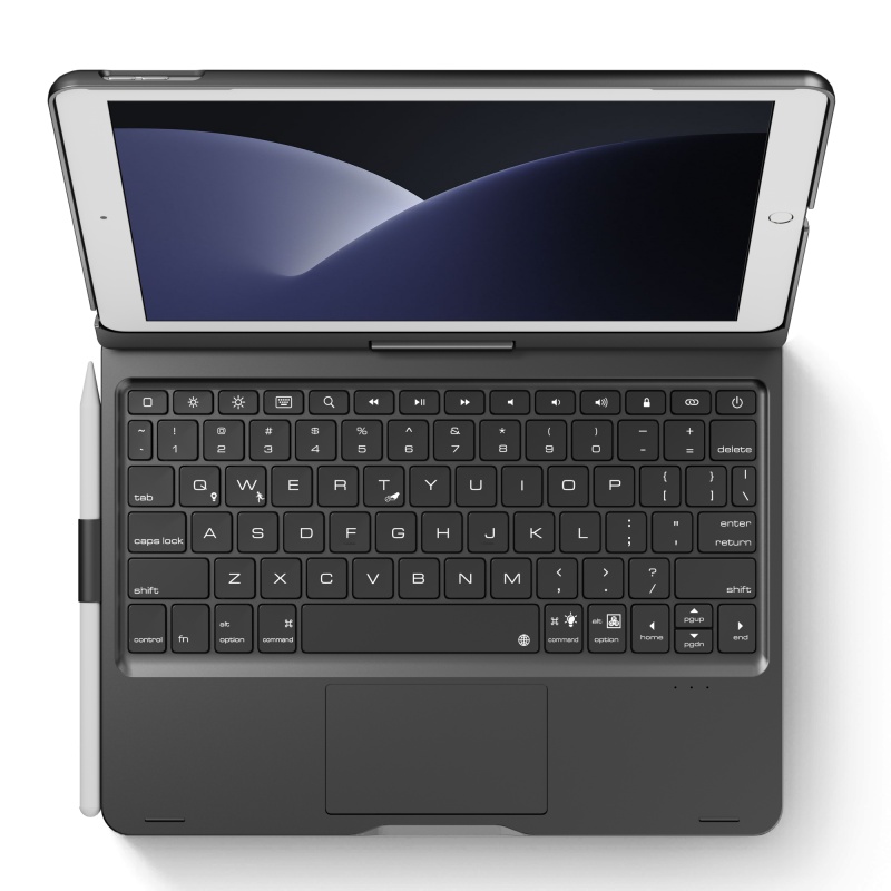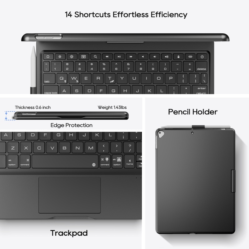 The 360-degree rotatable keyboard case is equipped with a precise multi gesture touchpad. The premium ABS hard shell design can protect all sides of the iPad. A row of iOS shortcuts for easy adjustment of volume and screen brightness. The Bulti-in rechargeable battery allows you type more than 180H (without backlit). The adjustable backlight provides you with an easy typing experience anytime, anywhere.
